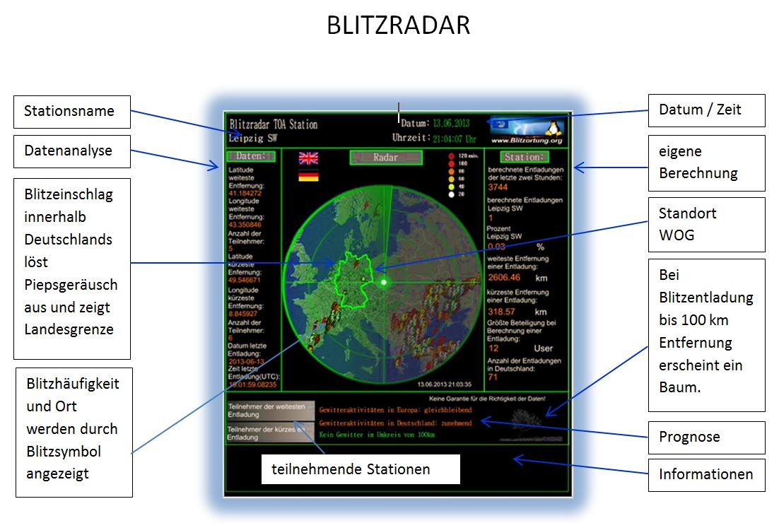 Aus der nachfolgenden Abbildung kann man die wesentlichen Informationen zur „Radaranzeige“ entnehmen. Man sieht auch, dass unsere Station an den Berechnungen entfernter Blitzentladungen leider kaum beiträgt, was auf die bereits geschilderte Situation zurückzuführen ist.