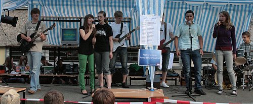 | Auch in diesem Jahr war das Hoffest ein würdiger Abschluss des Schuljahres. Besonderen Anteil am guten Gelingen hatten die 9. Klassen als Organisationsteam, Dominik Schöwe - als Tontechniker und die unermüdliche Frau Haubenreiser als Chefin der Veranstaltung. Erstmal haben wir als Schule die gesamte Beschallung selbst bewerkstelligt. Dank dem Förderverein. |