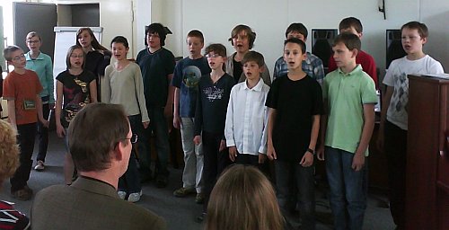 Kinderchor, Lehrerchor, Instrumentalisten und Schulband (unplugged) ließen es sich nicht nehmen, sich mit einem Beitrag persönlich von Beiden zu verabschieden.