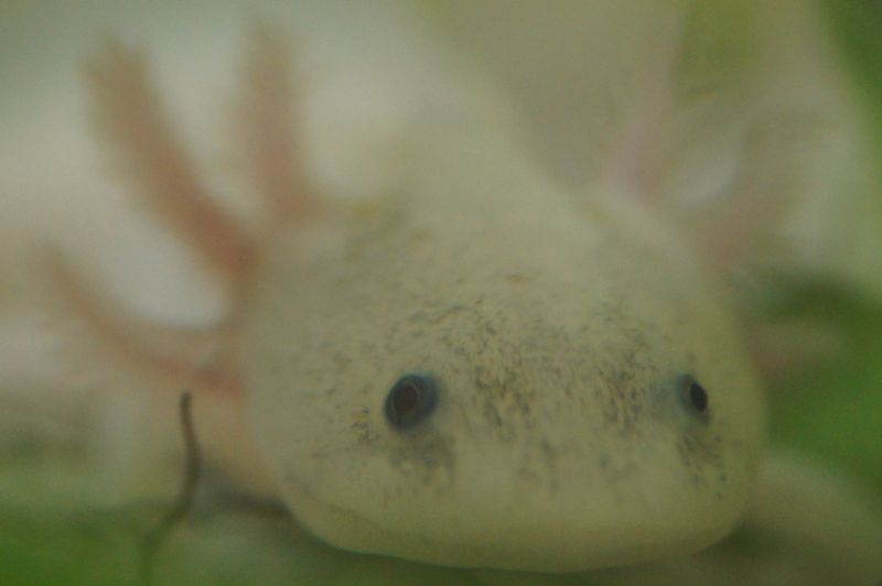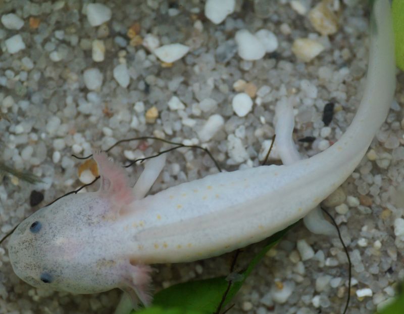 Unser Minilotl muss kein Singledasein mehr fristen. Seit vergangenem Montag teilt er sein aquarielles Ökosystem mit zwei etwa gleichaltrigen Spielgefährten. Darunter ist auch ein hübscher Weißling, so dass die ursprüngliche Vielfalt wieder hergestellt ist. Nur die biologisch Eingeweihten wissen, das ist kein Albino, sondern ein Leuzist – siehe Fotos – man beachte die Augen!!