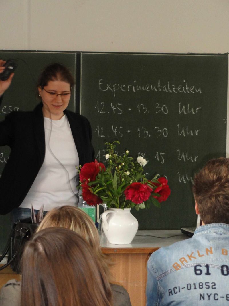 Frau Dipl.-Chem. Antje Kepper, eine ehemalige Schülerin unserer Schule, weihte uns in einem interessanten Vortrag über organische Synthesen in ihre Tätigkeit an der Universität Leipzig ein.