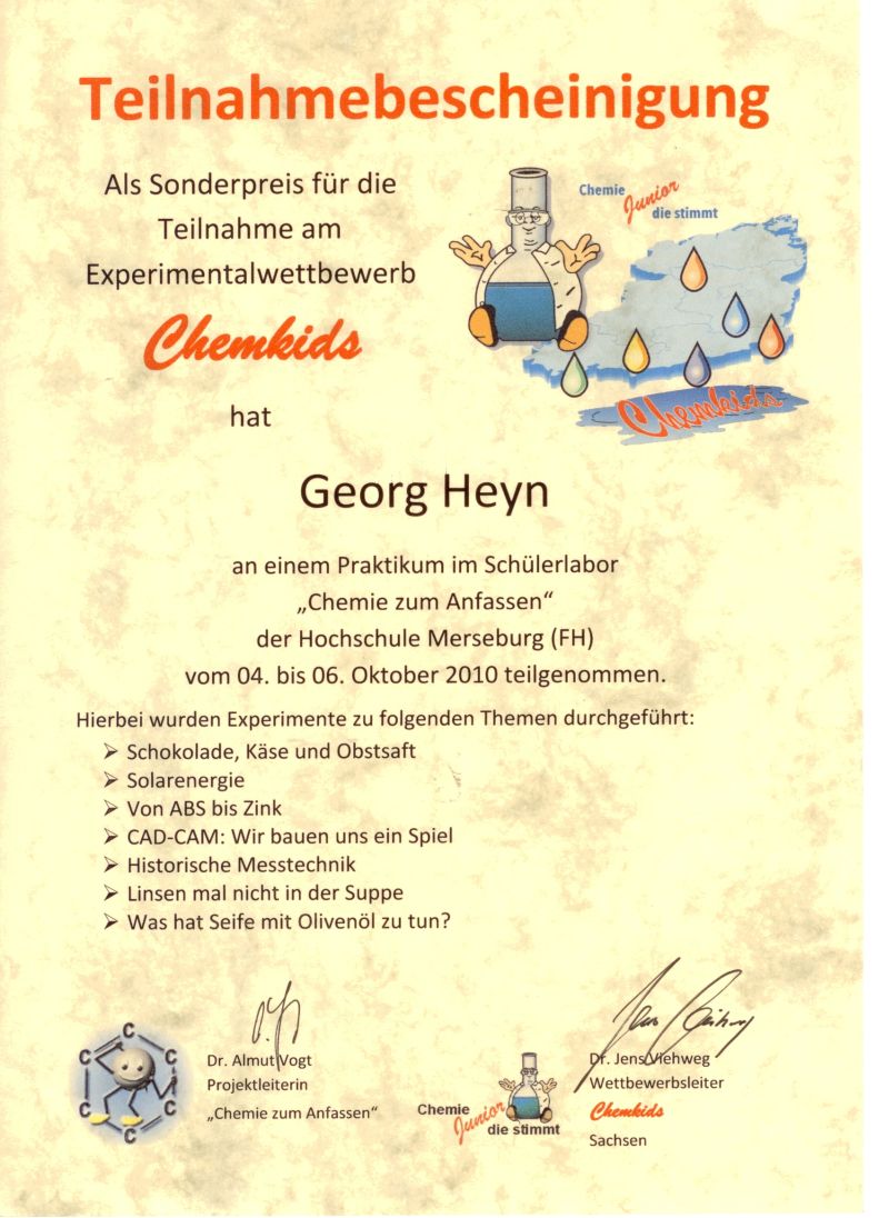 Wir zwei wurden anlässlich unserer sehr erfolgreichen Teilnahme am Experimentalwettbewerb CHEMKIDS mit der Teilnahme an einem Chemiepraktikum an der Fachhochschule Merseburg ausgezeichnet.