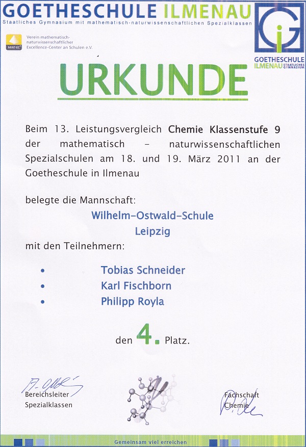 Zum 13. Mal trafen sich die Mannschaften der "Spezialklassen" mit vertiefter naturwissenschaftlicher Ausbildung zum Wettbewerb in Chemie am 18./19. März. Mit viel Vorfreude und auch ein wenig Hoffnung auf ein gutes Abschneiden wurde die Reise nach Ilmenau gestartet. Bereits am Freitag mußten sich die 11 Mannschaften den theoretischen Teil des Wettbewerbs widmen. Dabei wurde Wissen über Zink, dem chemischen Verhalten von Kohlenstoff aber auch über sauren Regen wie Kristallstrukturen abverlangt. Nach absolvierter Klausur ging es in die Fachhochschule Ilmenau, wo ein möglicher Standort des Studierens vorgestellt wurde.