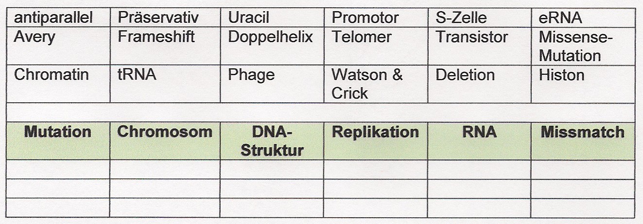 Eine einfache Aufgabe war: Ordnen Sie die in der Tabelle aufgeführten Begriffe so, dass jeweils die drei Begriffe untereinander stehen, die zu einem gemeinsamen Thema gehören.