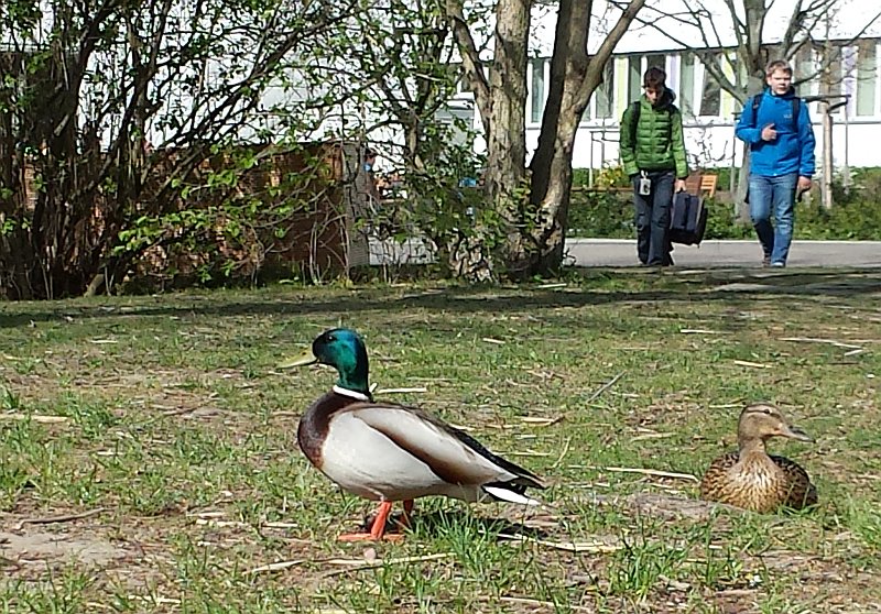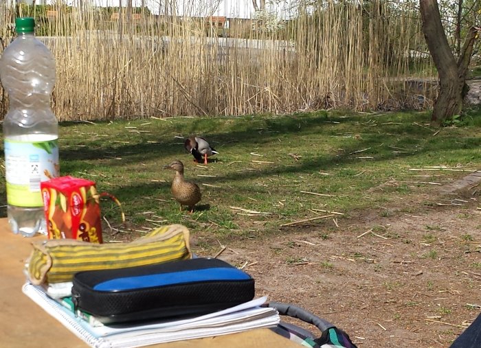 Offensichtlich angezogen vom guten Klima watschelte ein Enten-Pärchen direkt in unserer „Klassenzimmer“. Angetan von der Diskussion ließen sie sich auch durch das Pausenklingeln und die eintreffende Schülerschar nicht stören.