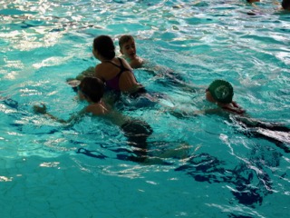 Nach dem Umziehen, durften wir erst einmal ein wenig planschen. Danach begannen die aufregenden Wettkämpfe. Das waren Brustschwimmen, Tauchstaffel, Freistil. Bei einer Disziplin, musste man einen Mitschüler transportieren.