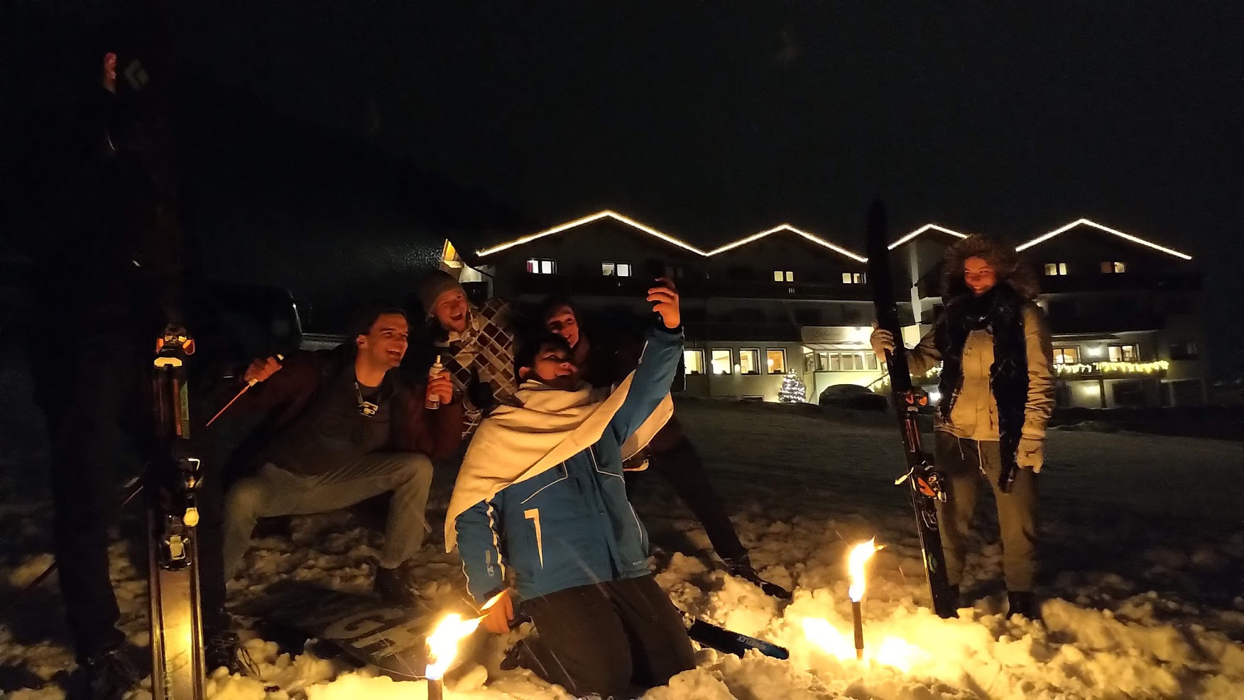 Unbestrittener Höhepunkt war die Skitaufe am Donnerstagabend. Hier zelebrierten unsere drei Skigötter N, J & G mit professioneller Leichtigkeit ein eiskaltes Ritual, dem kein Täufling entkommen konnte. Ein Täufling, genannt „Schneekanone“, erkannte geistesgegenwärtig die Wertigkeit der plötzlichen Prominenz und nutzte die Gunst der Stunde für ein socialmedia-wirksames Selfie …