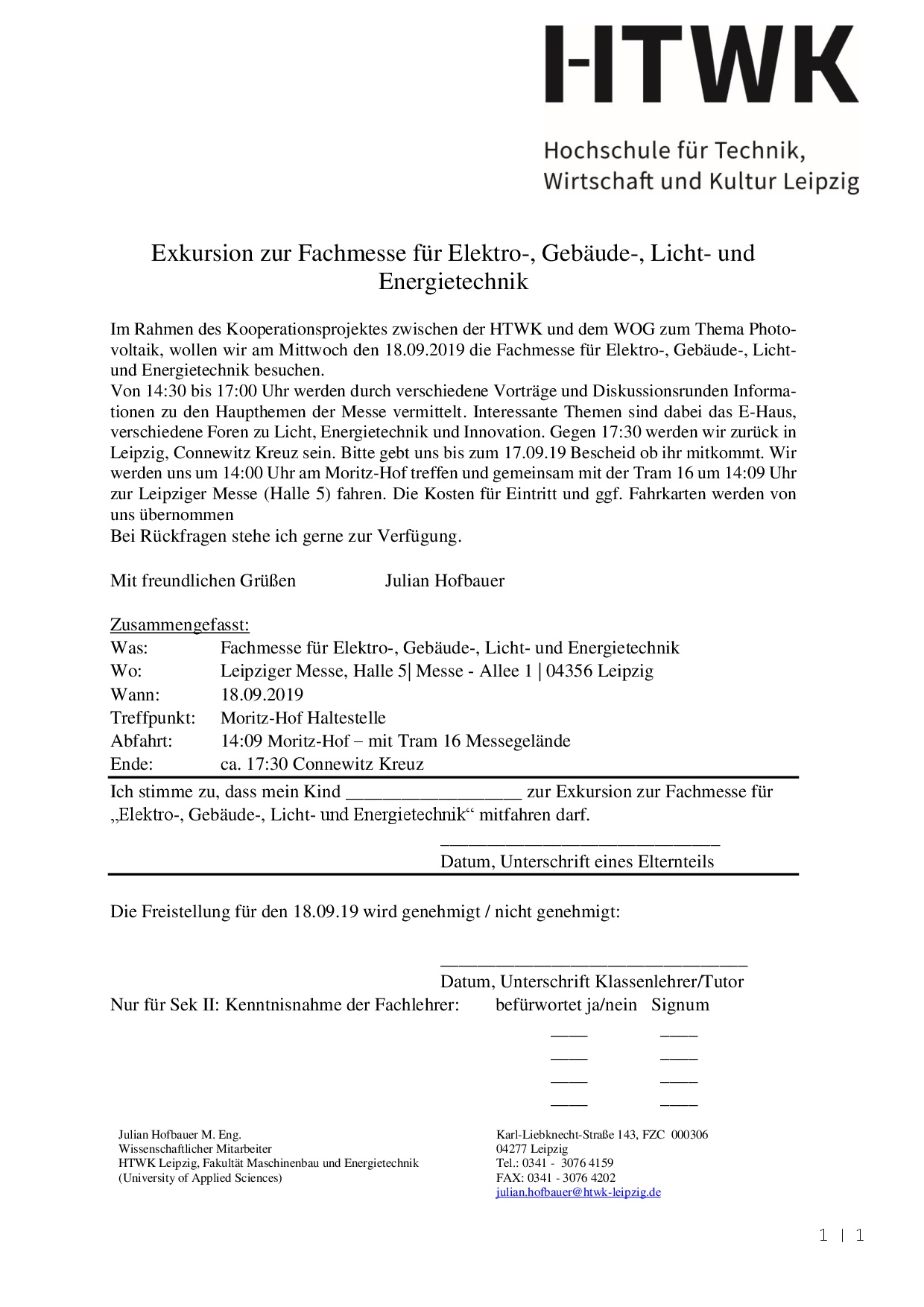 Im Rahmen des Kooperationsprojektes zwischen der HTWK und dem WOG zum Thema Photovoltaik, gibt es die Möglichkeit, am Mittwoch den 18.09.2019 die Fachmesse für Elektro-, Gebäude-, Licht- und Energietechnik zu besuchen.