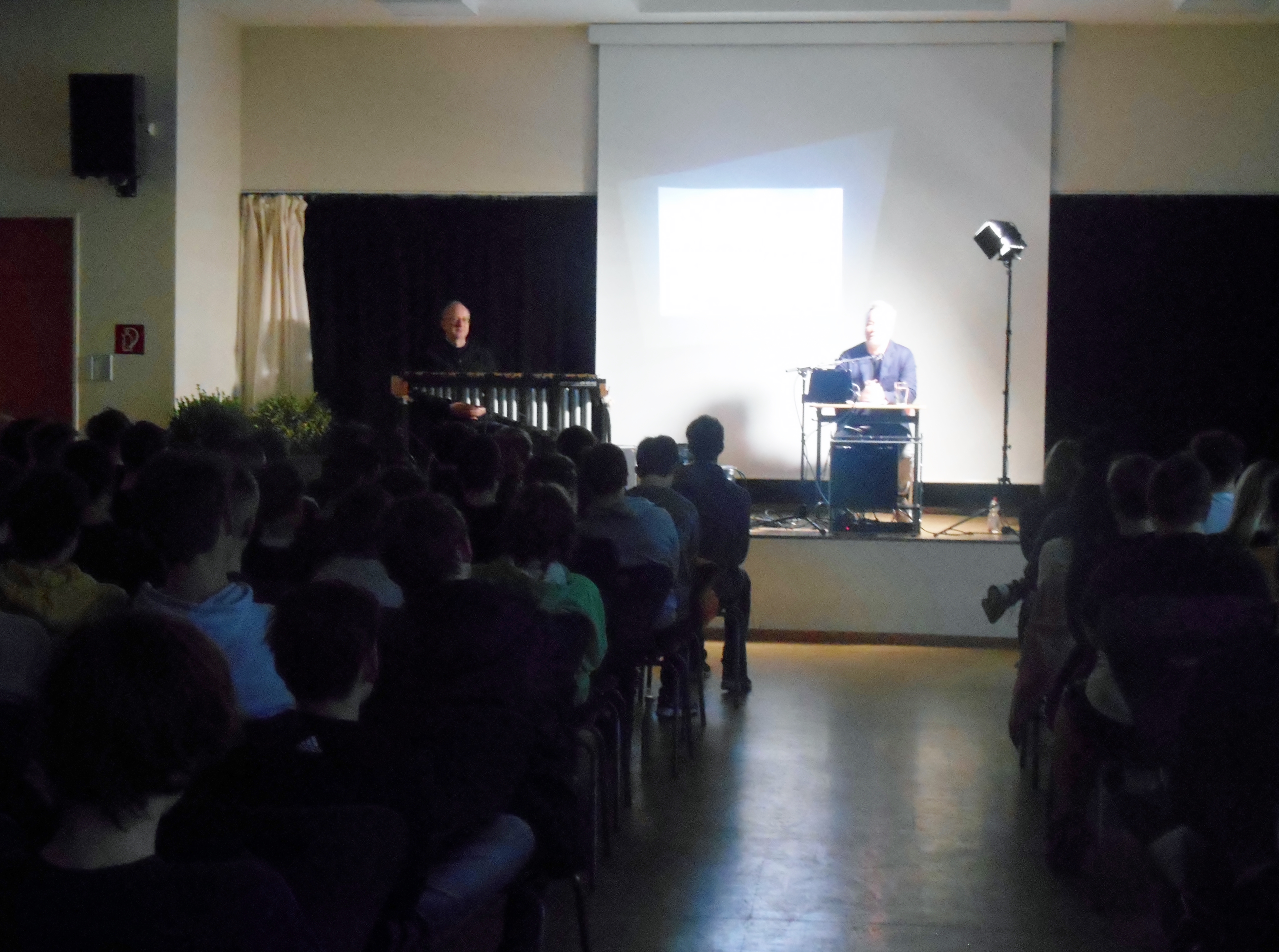 Gespannte Stille herrscht im Raum. Die Schülerinnen und Schüler der Oberstufe lauschen an diesem frühen Montagmorgen den Worten von Thomas Darchinger, der gemeinsam mit dem Jazzmusiker, Wolfgang Lackerschmid in unserem Haus zu Gast ist.