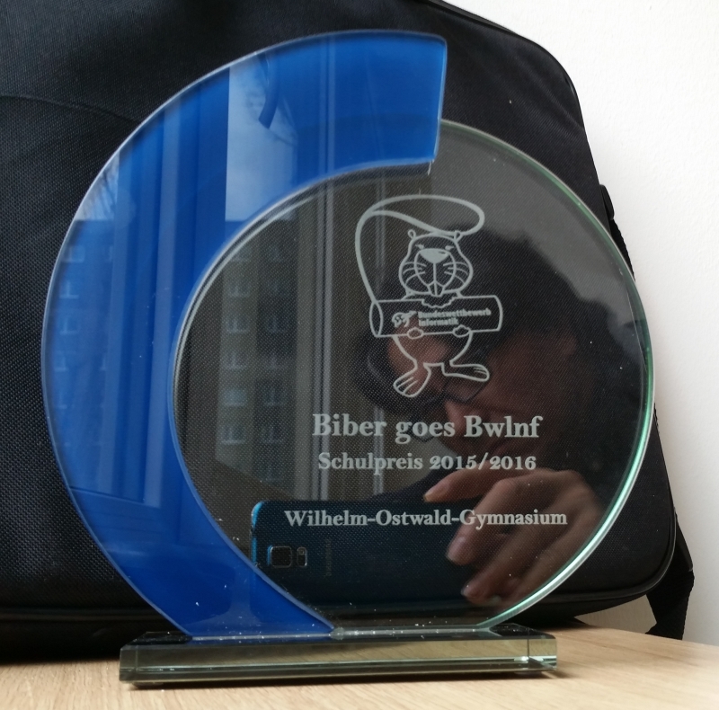 So sieht er aus: Unser "Biber goes BwInf" - Glaspokal für Schulen, die wiederholt zu BgB-Gewinnerschulen zählten.