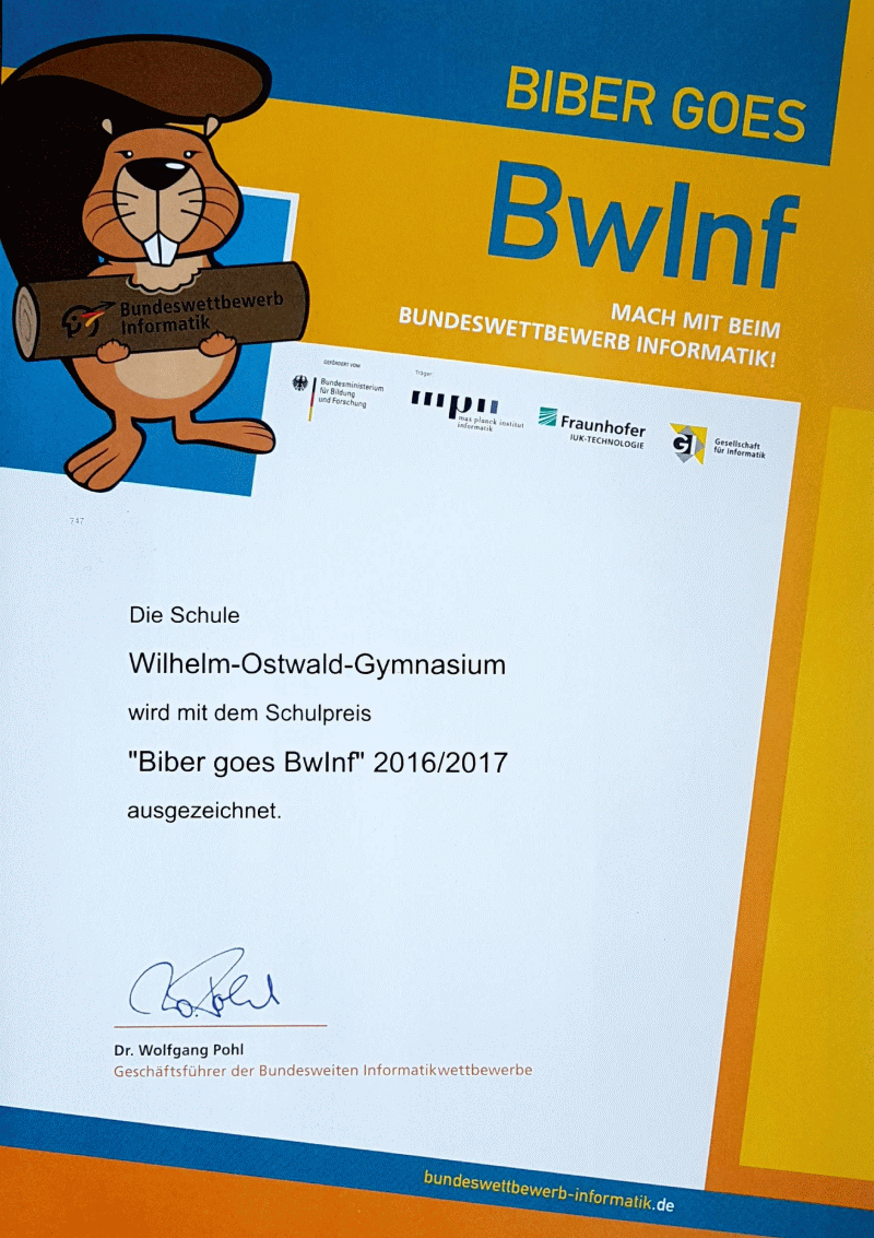 Erneut hat es unsere Schule geschafft. Auch in diesem Jahr haben wir die Kriterien für diesen Schulpreis erfüllt. Insgesamt 9 Schüler schafften den Sprung vom Informatik-Biber-Wettbewerb zum Bundeswettbewerb Informatik. Dafür warten nicht nur Preise für jeden Teilnehmer sondern auch der Schulpreis, den wir dieses Jahr als exclusiven "Holz"-Pokal bekamen. Schaut einfach mal in die Vitrine im Erdgeschoss.