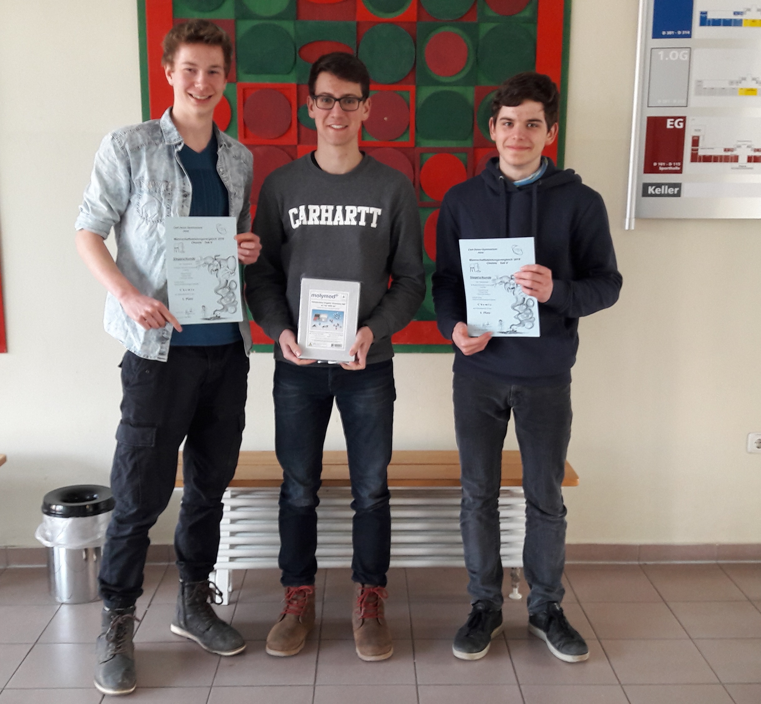 Mit dem Sieg in Jena haben Tilman Otto (1.v.l.), Pascal Reeck und Christoph Doktor jeweils alle ausgetragenen Mannschaftswettbewerbe in Chemie (Klasse 9, 10, Sek.II) gewonnen!