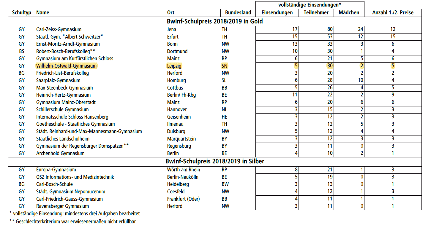 herzlichen Dank für die starke Beteiligung Ihrer Schule am 37. Bundeswettbewerb Informatik! Das Wilhelm-Ostwald-Gymnasium hat die Bedingungen des BwInf-Schulpreises erfüllt. Wir möchten Ihrer Schule deshalb den Schulpreis in Gold verleihen und sie als "BwInf-Schule 2018/2019" auszeichnen. Herzlichen Glückwunsch! Aimée Eisele -- |