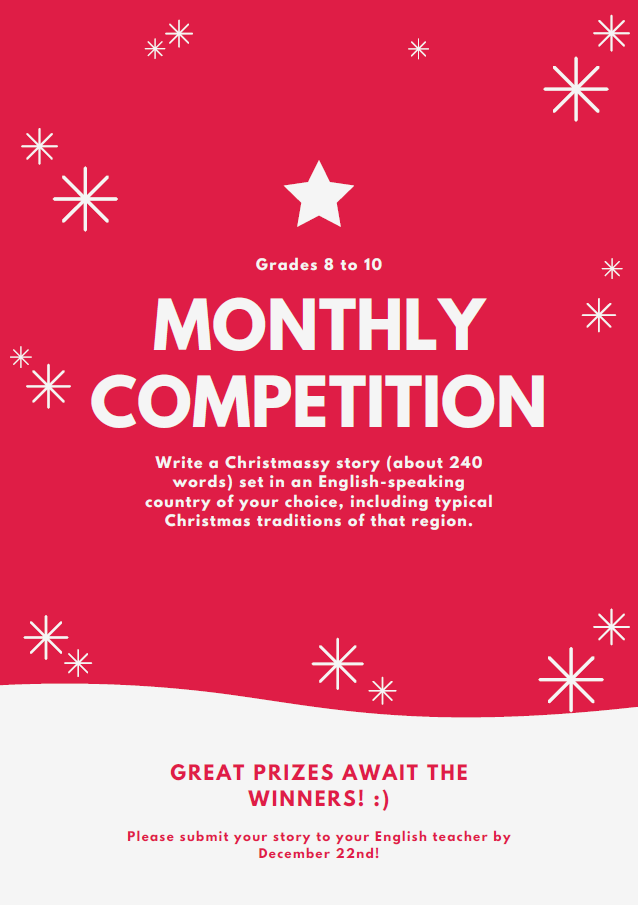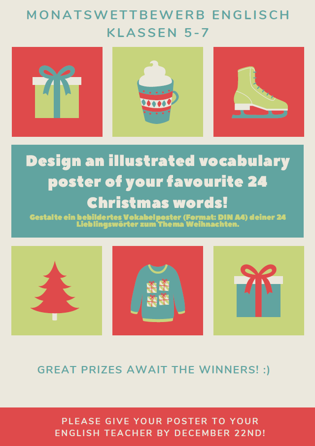 Endlich ist es soweit! Im Dezember stellt das Fach Englisch die Aufgaben für unseren Monatswettbewerb! Achtung: Es gibt zwei Aufgaben - eine für die Klassenstufen 5-7 und eine für die Klassenstufen 8-10. Es erwarten euch tolle, magisch-mysteriöse Überraschungspreise.