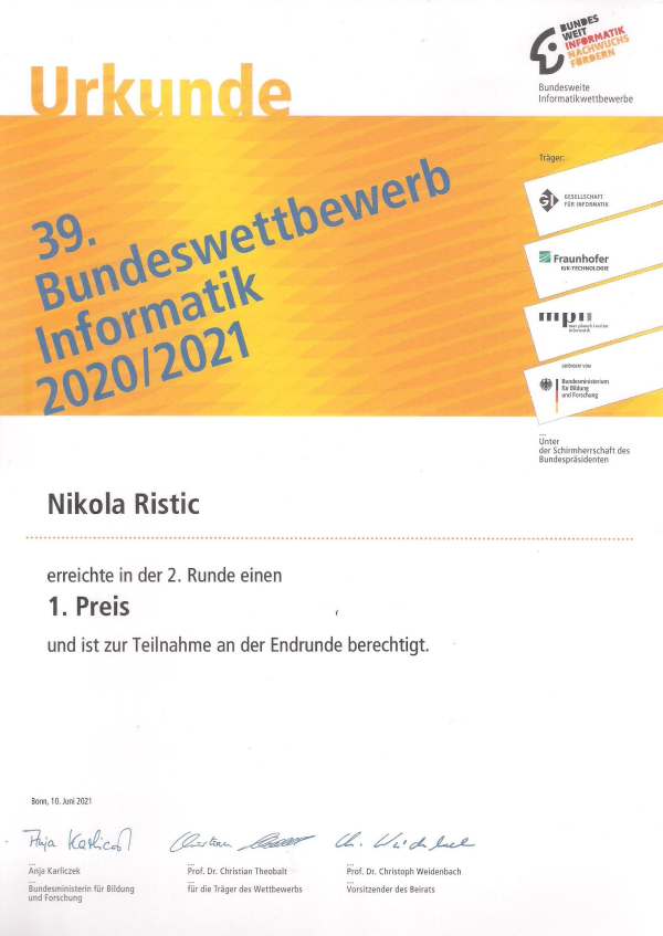 Er gehört zu den 30 Besten beim Bundeswettbewerb Informatik und nimmt an der Endrunde des Bundeswettbewerbs für Informatik teil.