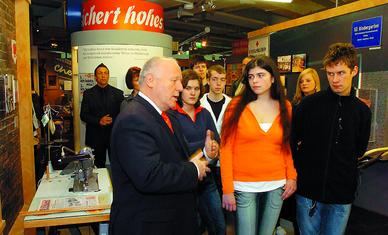 Die Klasse 10/1 des Leipziger Wilhelm-Ostwald-Gymnasiums lässt sich am gestrigen Morgen vom Zeitungsmenschen im Foyer ein wenig auf den Zahn fühlen, bevor Sachsens Regierungschef dazustößt. An seiner Seite besichtigen die Jugendlichen die seit Oktober neu gestaltete Dauerausstellung im Zeitgeschichtlichen Forum Leipzig.